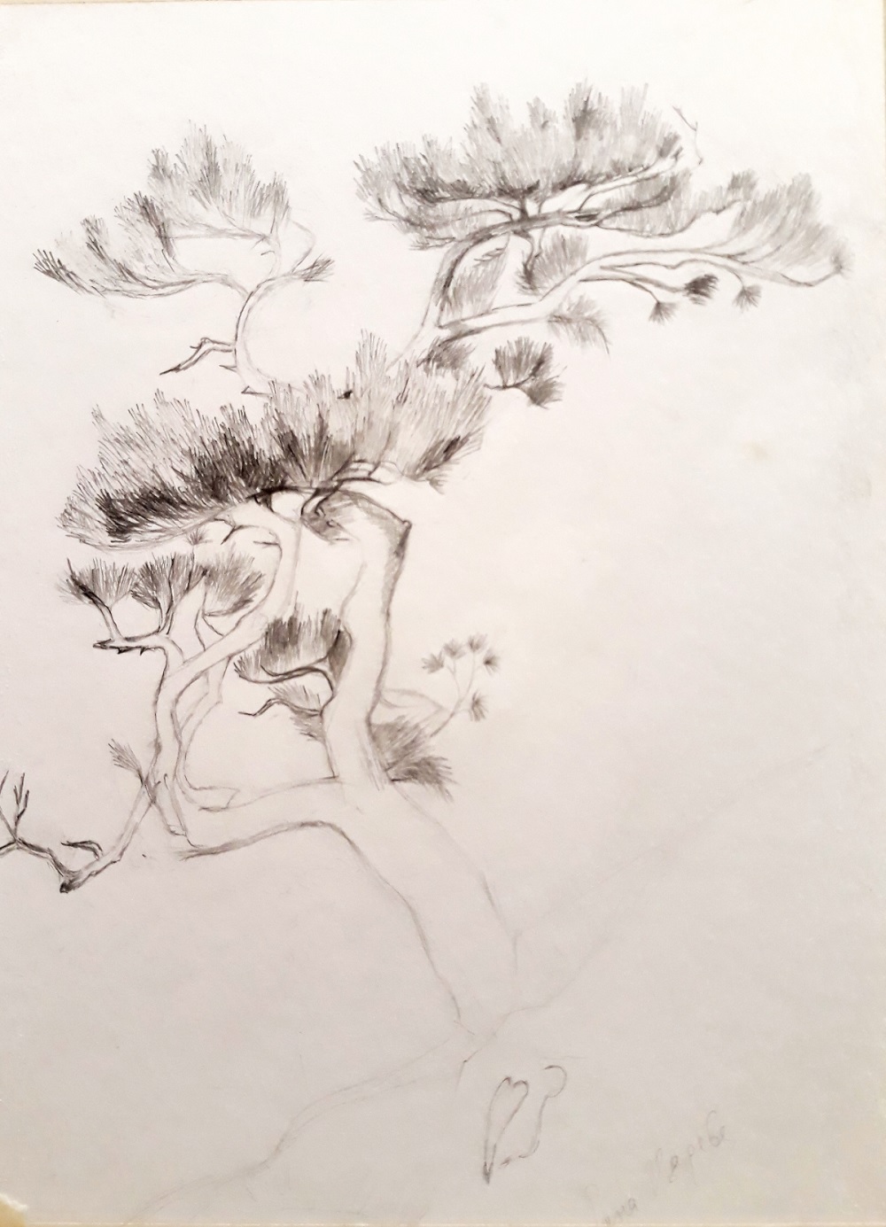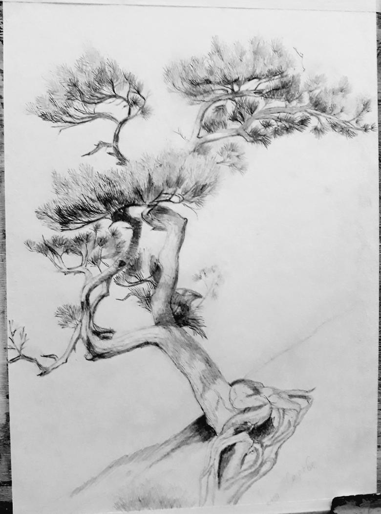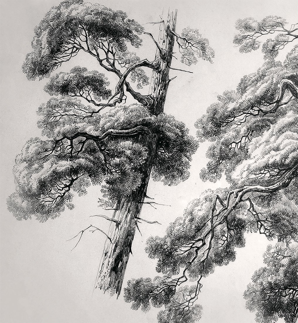 - De l'autre côté, des branches moins puissantes sont dessinées. Leur nombre est également plus réduit. Un ou deux nœuds sans recouvrement d'aiguille de ce côté ajouteront de la vérité au dessin.