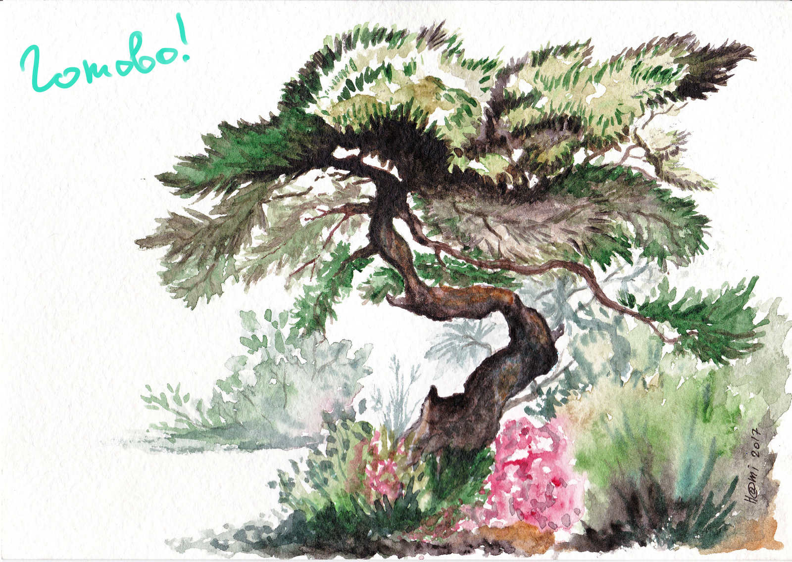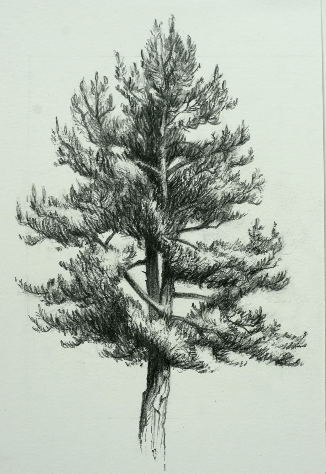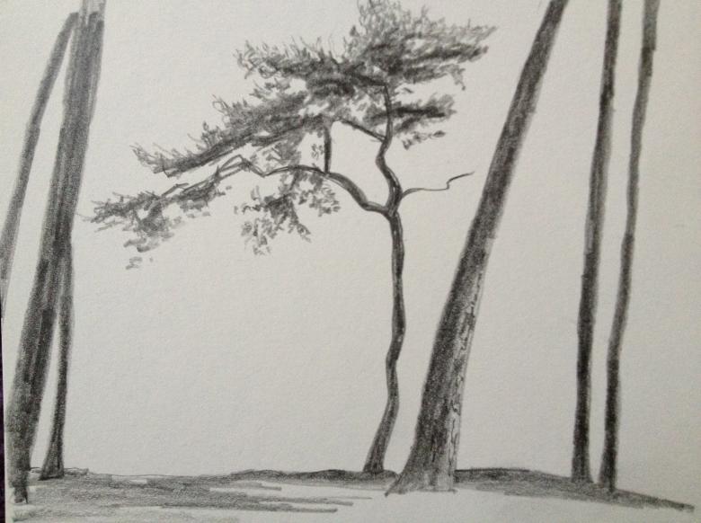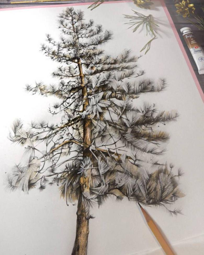 - Quelques coups de pinceau le long du tronc lui donneront un aspect tridimensionnel. C'est ainsi que l'on dessine l'écorce d'un pin.