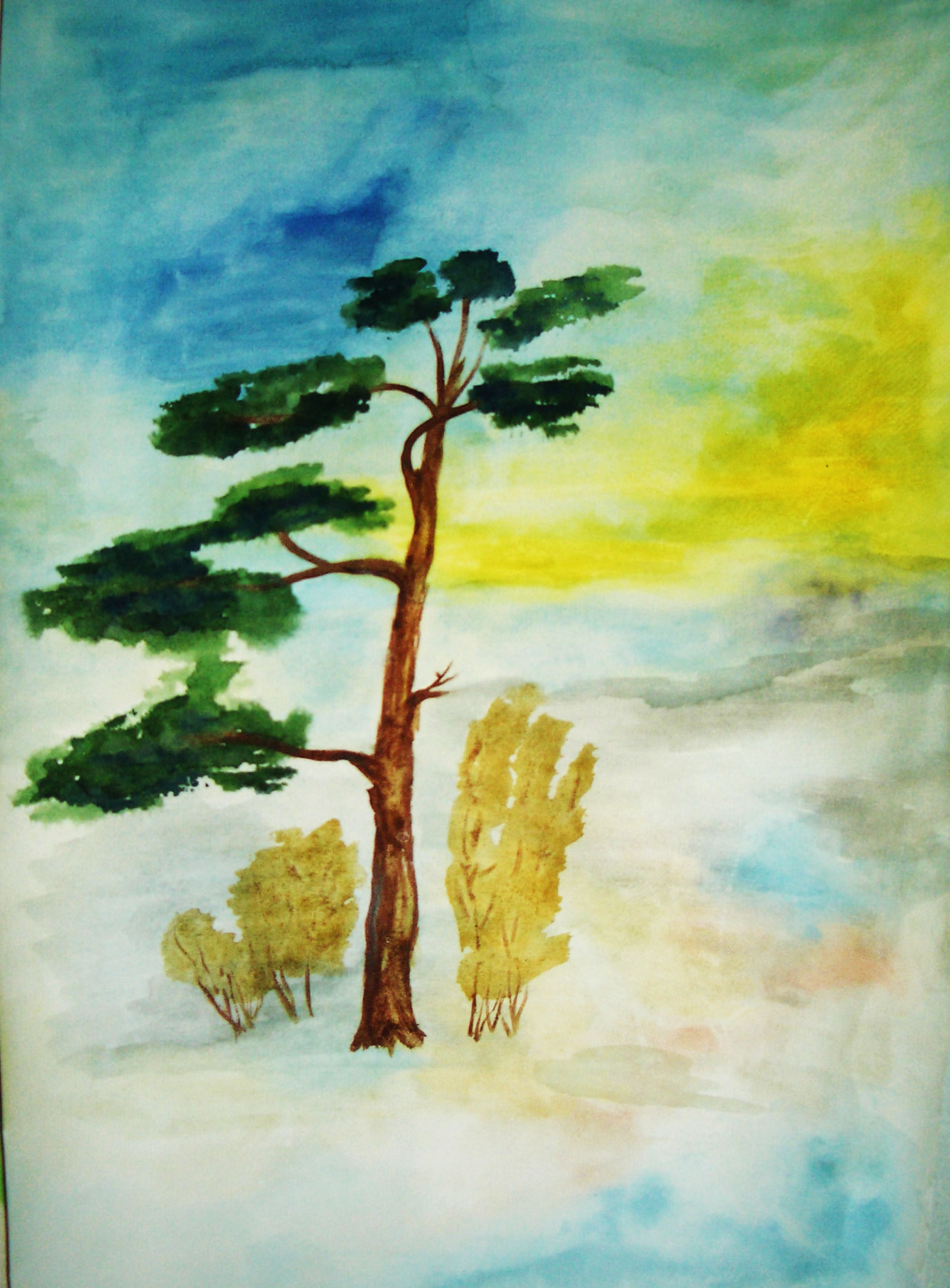 L'image d'un pin est colorée à la peinture ou aux crayons.