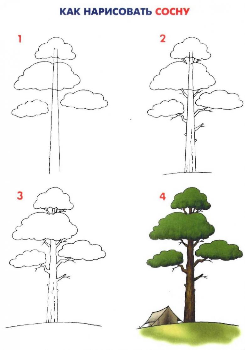 Les enfants de tous âges savent qu'un pin a un tronc droit surmonté d'une couronne luxuriante. Le dessin ci-dessous montre, étape par étape, comment dessiner à un enfant un magnifique pin pour qu'il ressemble à un vrai arbre.