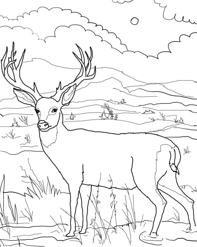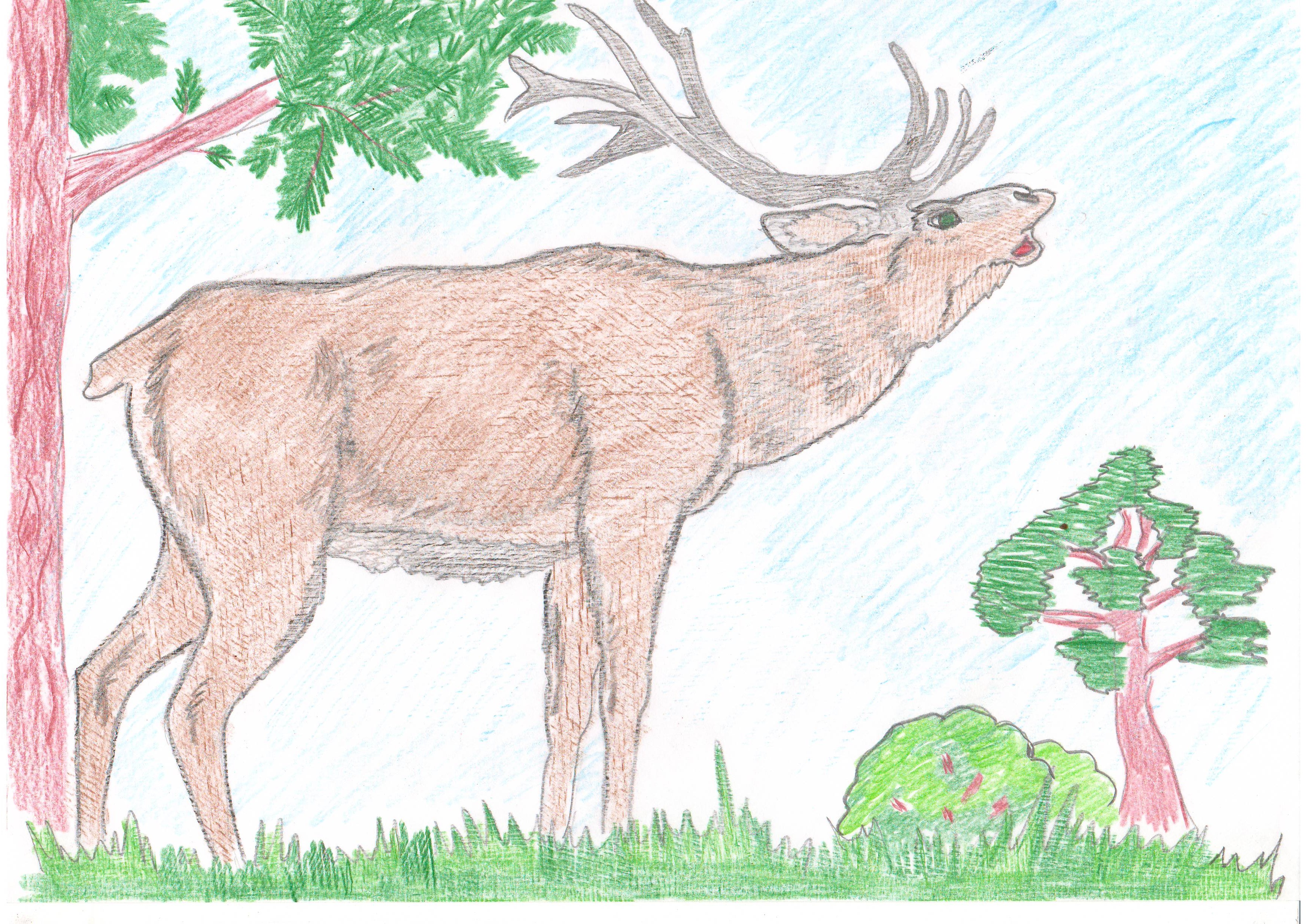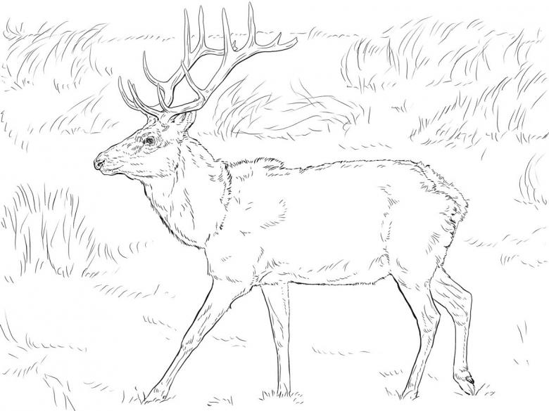 Lors de la coloration, n'oubliez pas que la queue et la zone située sous le cou sont blanches. Le principal trésor de la bête est ses cornes ramifiées et ses sabots fendus sur les membres, qui l'aident à trouver sa nourriture et à éviter de tomber dans le sol marécageux.