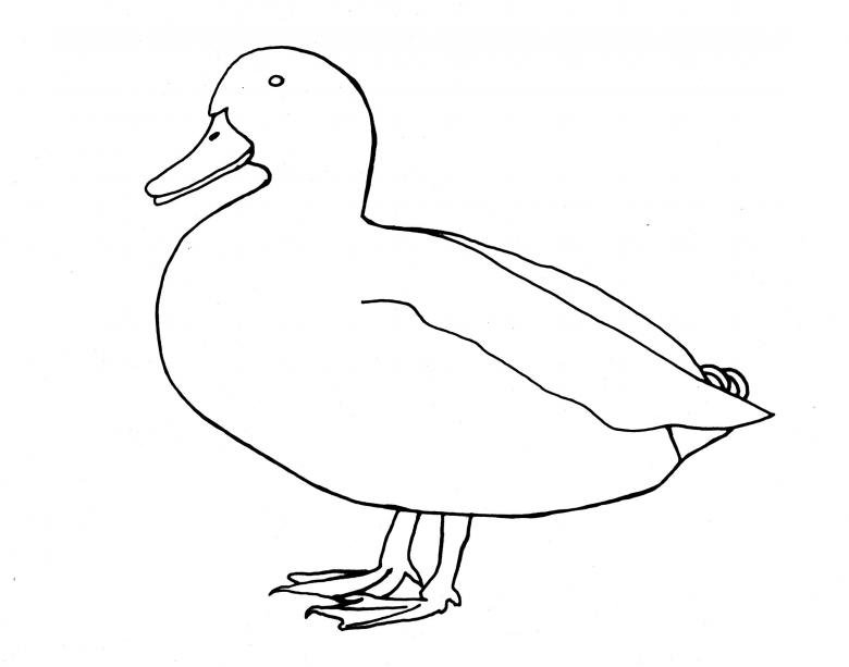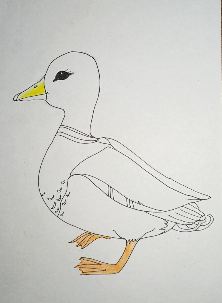 L'oiseau sera perché à la surface de l'eau, flottant sur les vagues. Le numéro 2, qui a un cou court, est tiré au sort. Il s'agit d'une représentation schématique de la tête. Le torse du canard est allongé et le front présente une excroissance orange vif distinctive.