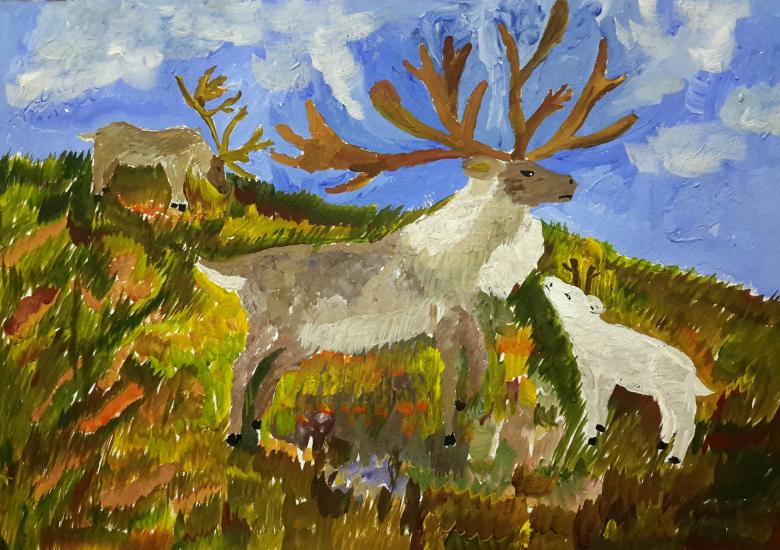 Vous pouvez montrer des éparpillements de baies de myrtilles, de mûres des marais, d'airelles rouges, les champignons poussent ici aussi. Des trous de nuages blancs comme neige sont laissés sur le ciel bleu. L'utilisation de peinture noire n'est pas recommandée, pour éviter d'assombrir le paysage.