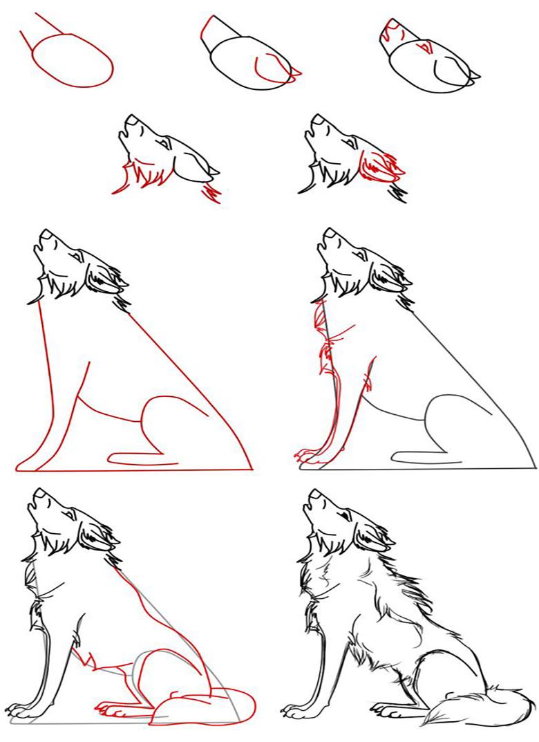 Imaginez que le loup est assis dans la neige et qu'il hurle. Nous devons apprendre à dessiner le prédateur assis. La tête sera encore plus relevée au sommet. La séquence de son image sera la même :