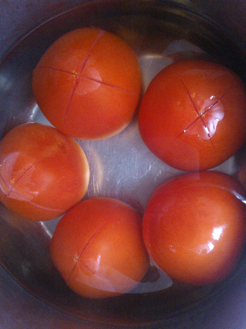 Une sorte d'échaudage avec de l'eau bouillante. Cette méthode permet également de peler rapidement un grand nombre de tomates.