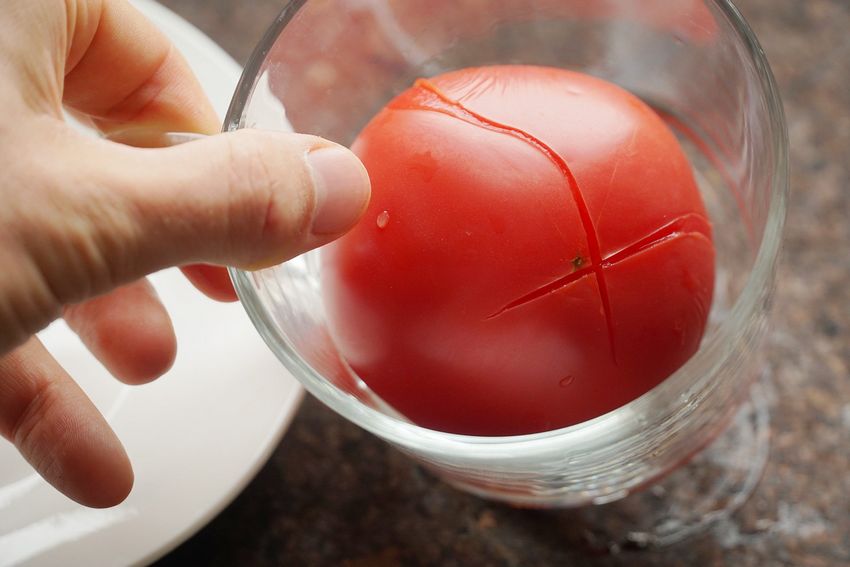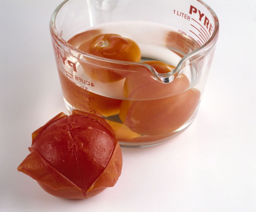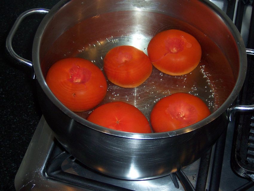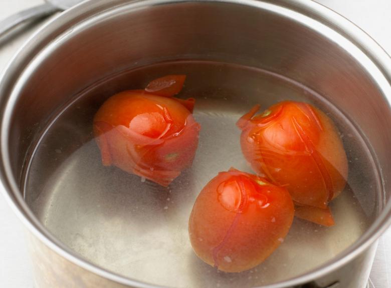 La différence est que les fruits ne sont pas placés dans de l'eau bouillante mais cuits à la vapeur en surface pendant 30 à 40 secondes. Ensuite, les tomates doivent être trempées dans de l'eau froide et leurs peaux épluchées.