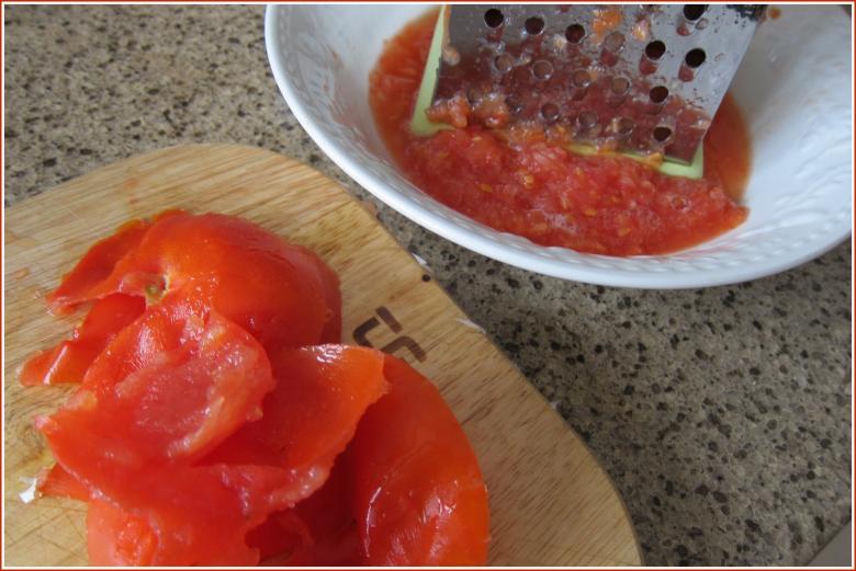 Une autre façon de peler les tomates est d'utiliser une râpe de cuisine à gros grains. L'avantage de cette méthode est qu'elle vous permet de peler et de broyer les tomates en même temps. Elle peut être utilisée lorsqu'il faut râper rapidement quelques tomates bien mûres, par exemple pour une sauce, et elle est très facile à réaliser. Les tomates lavées sont coupées en deux dans le sens de la longueur. Chaque moitié est pressée avec la tranche contre la râpe, la peau contre la paume de la main et râpée.