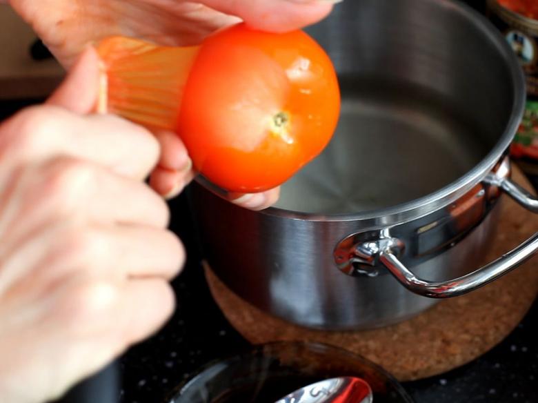 - Faites-les tomber dans une casserole d'eau bouillante pendant 10 à 30 secondes (selon la maturité du fruit). Il est préférable de mettre un lot de tomates dans une passoire ou une passoire afin de pouvoir les retirer rapidement toutes ensemble ;