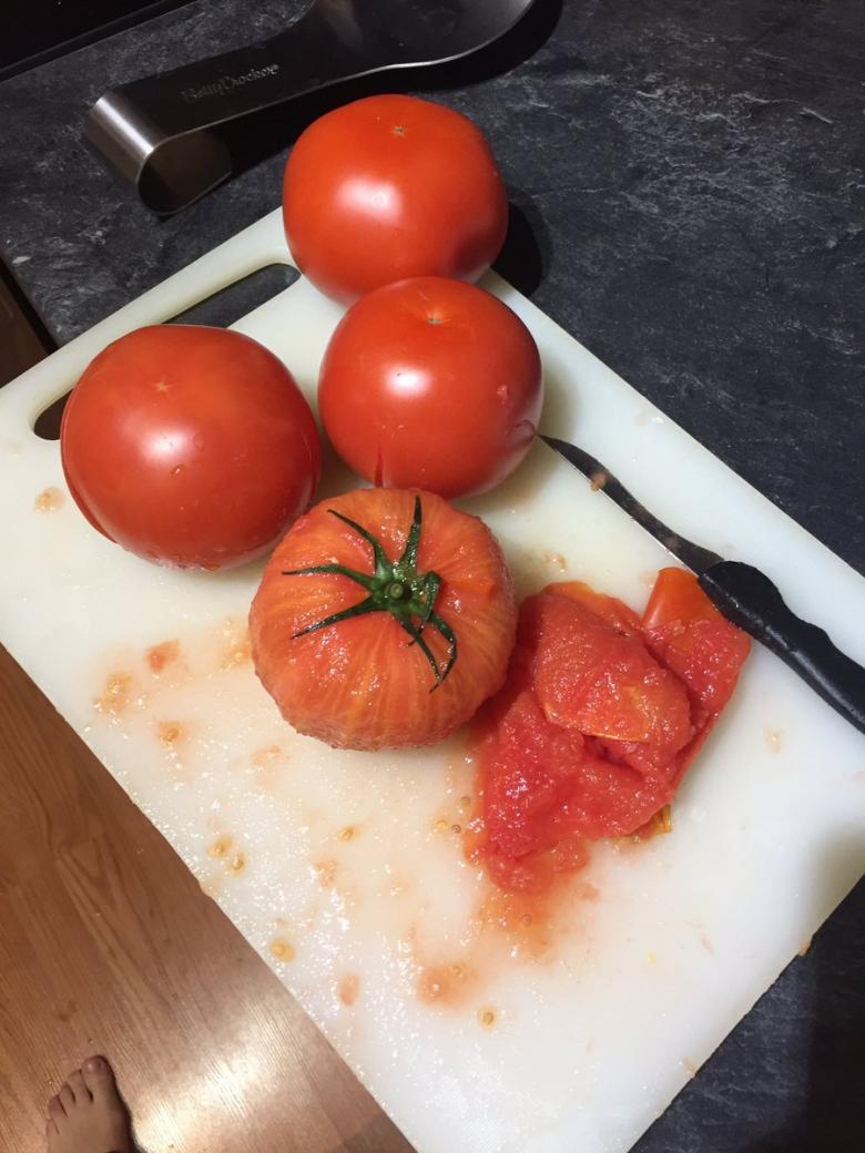 - À l'aide d'un couteau bien aiguisé, coupez la peau des tomates sur le pédoncule et les côtés ;
