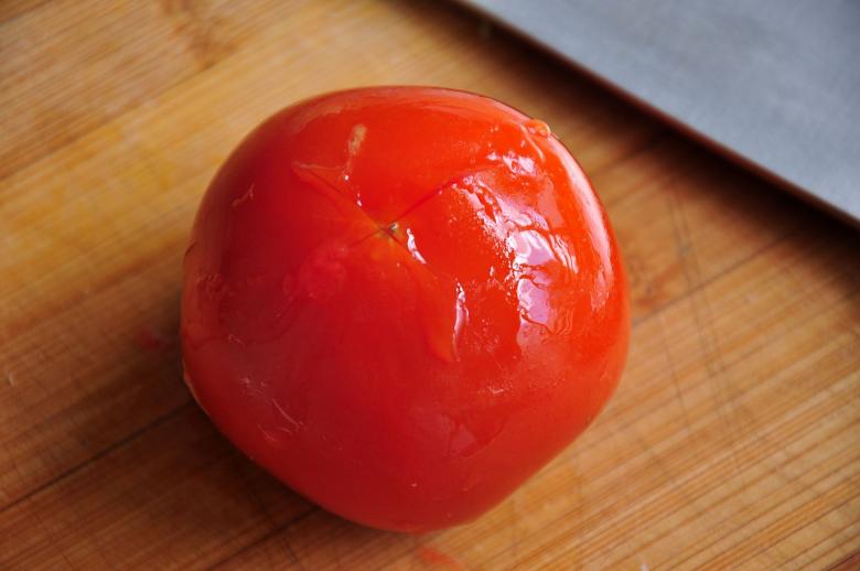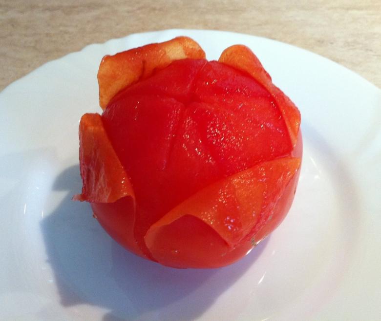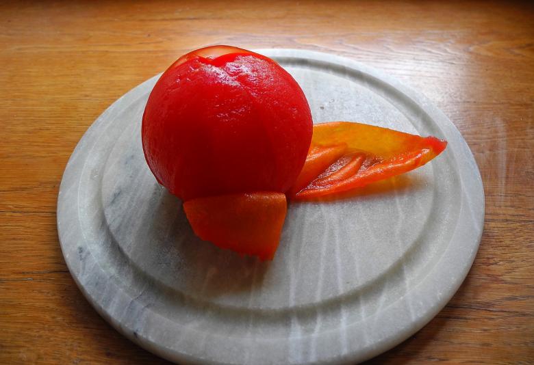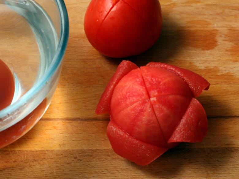 Faites légèrement levier sur la peau du côté opposé au pédoncule et la tomate se détache facilement. Si vous ne retirez pas entièrement la pelure mais que vous la pliez vers le haut, vous pouvez créer une décoration originale pour les plats.