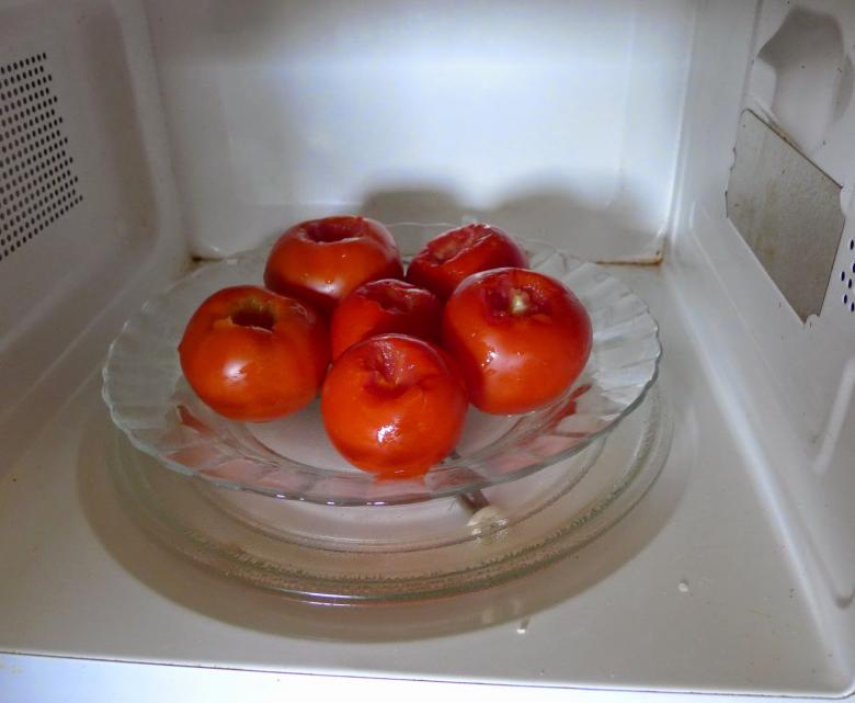 Le micro-ondes ne doit être utilisé que pour les tomates qui seront cuites plus tard. En raison de la rapidité des micro-ondes, il est difficile d'attraper le moment de ramollissement.