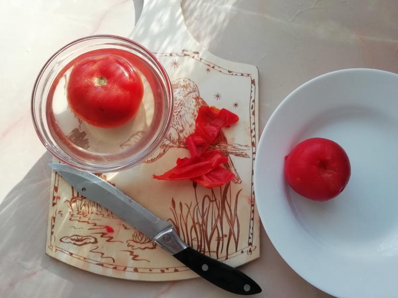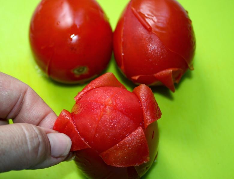 - Une fois que les tomates ont refroidi, pelez-les à l'aide d'un couteau sur le côté de l'incision.