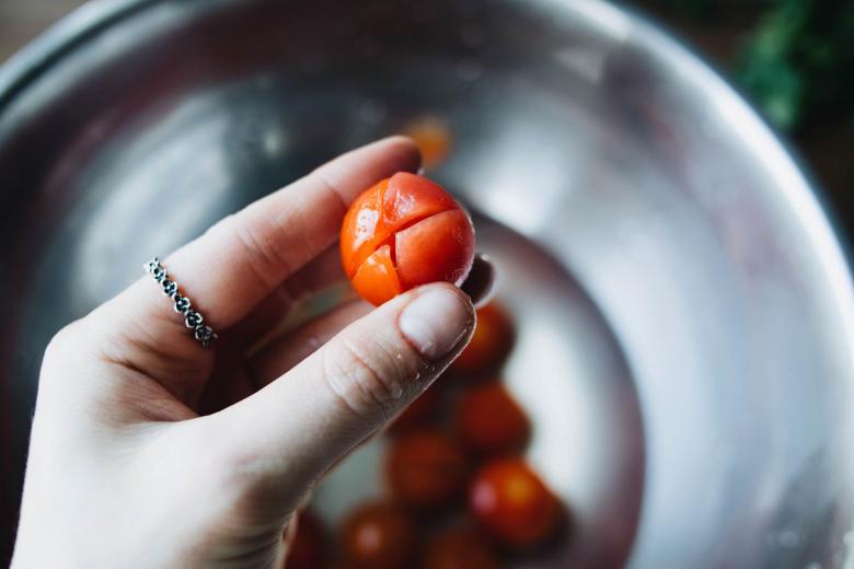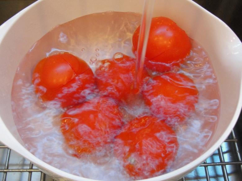 - égoutter l'eau chaude et verser de l'eau froide du robinet sur les tomates ;
