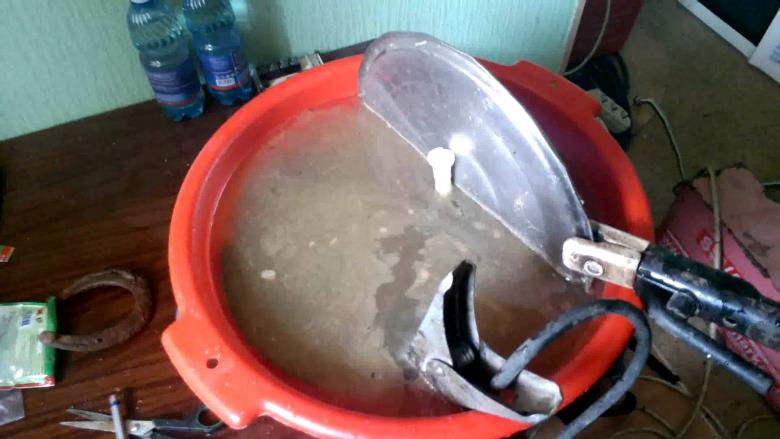 - De l'eau est versée dans un récipient. Une solution est créée. La quantité de soude est ajoutée au cas par cas, en fonction de la forme du produit, de la distance entre les électrodes et de la tension nominale.
