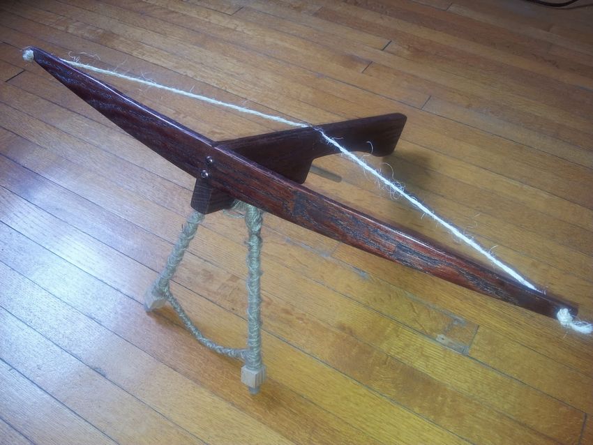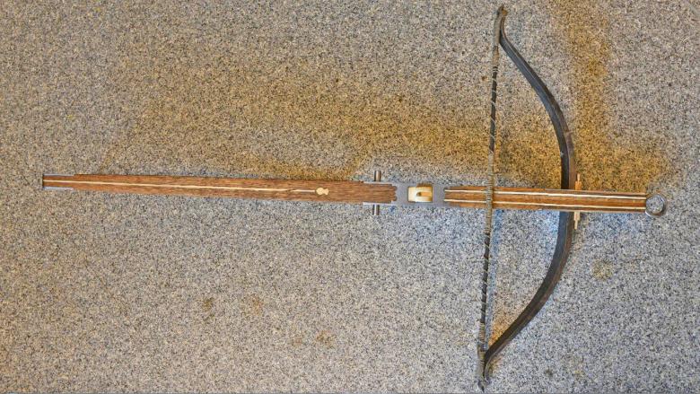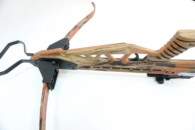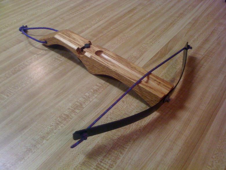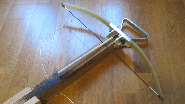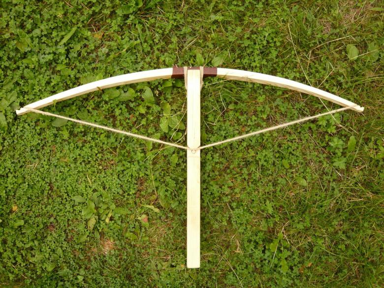 L'arc peut être fabriqué à partir de n'importe quel bois. Il s'installe dans un trou déjà percé. Il est nécessaire de percer à côté le trou pour la détente ainsi qu'une rainure pour le boulon qui fixera la corde de l'arc.