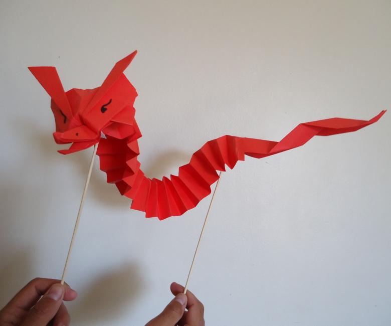 Vous pouvez fabriquer un torse en accordéon avec du papier, fixer des bâtons sur les bords et les utiliser pour déplacer le dragon.