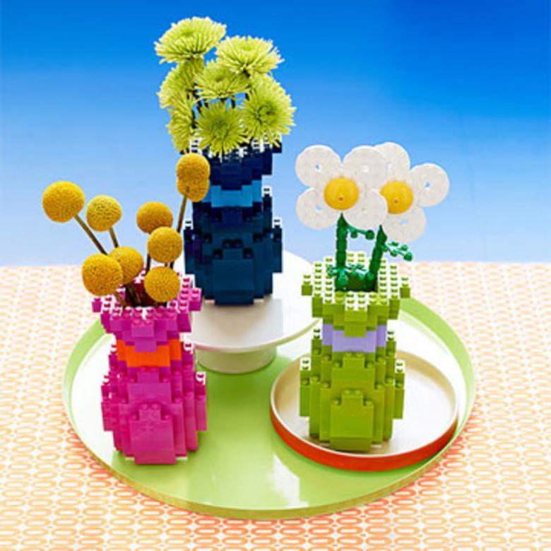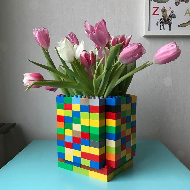 Si un bouquet de fleurs est un attribut constant dans le salon, dans la cour il y a un parterre de fleurs, vous pouvez toujours couper des fleurs, recueillir un vase pour eux de "Lego" est une idée merveilleuse, digne d'attention et d'effort. Pour les lys, les roses, les myosotis, les pivoines, les chrysanthèmes, les orchidées, les œillets, vous pouvez choisir une autre palette, faire plusieurs vases à la fois. Ils ne tomberont pas des comptoirs, des étagères ou des rebords de fenêtre et ne se transformeront pas en une myriade d'échardes. C'est un vase sûr, très beau.