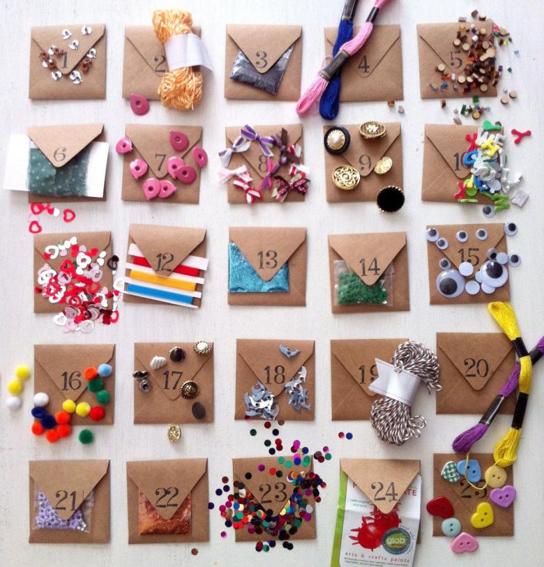 Pour les fabriquer, vous pouvez prendre du papier épais, mais aussi coudre du tissu avec des appliques. Une base est faite de papier Watman et une feuille avec des fenêtres en pointillés est placée dessus. Les cadeaux sont placés entre les couches de papier. Le panneau supérieur est décoré et peint. Techniquement, chaque fenêtre peut être décorée différemment. Par exemple, les portes peuvent être maintenues en place à l'aide de rubans, de boutons et de boucles (dans la version textile), et de velcro.