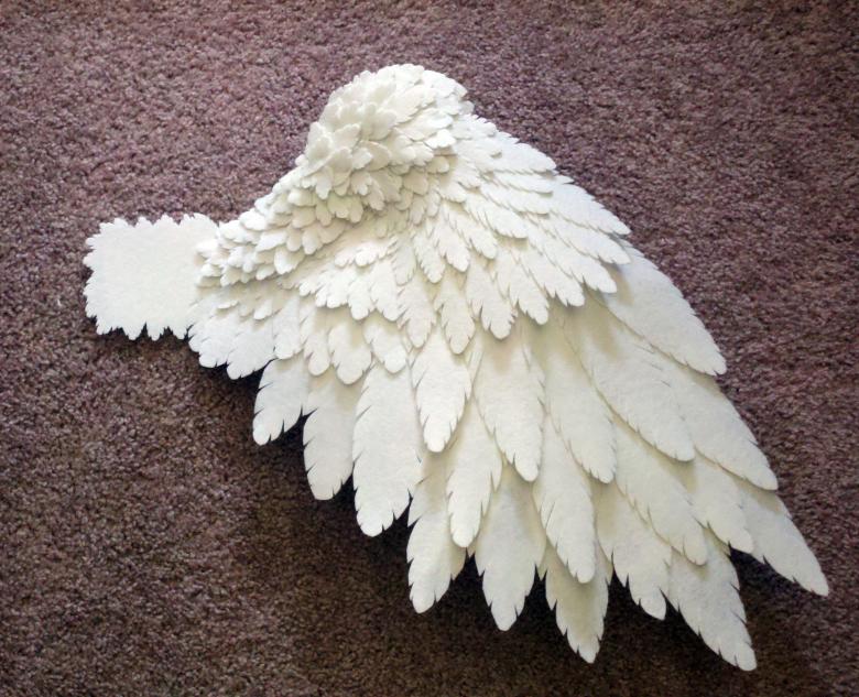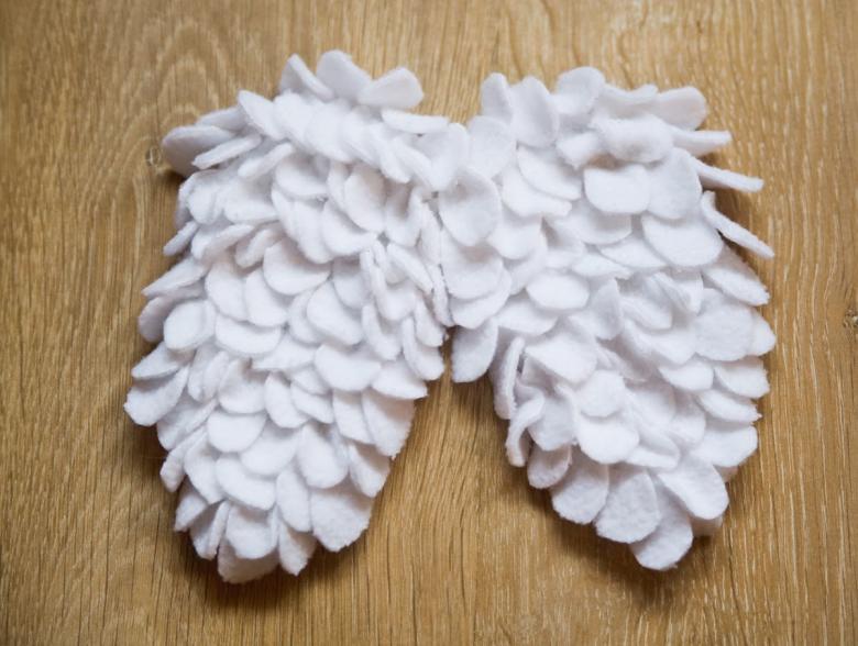 - Coupez des plumes de différentes tailles dans du tissu pour que vos futures ailes aient l'air naturelles. Utilisez un pistolet à colle pour coller les plumes du bas vers le haut. Les plus grandes plumes doivent être attachées en bas et les plus petites en haut.