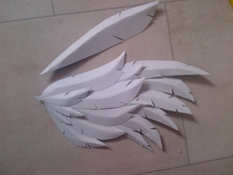 Ensuite, il faut fabriquer des ébauches de plumes. Pour plus de commodité, ils peuvent être imprimés. Il est préférable de coller les plumes à partir du bas de la base, sinon la colle ne sera pas visible et les superposer.