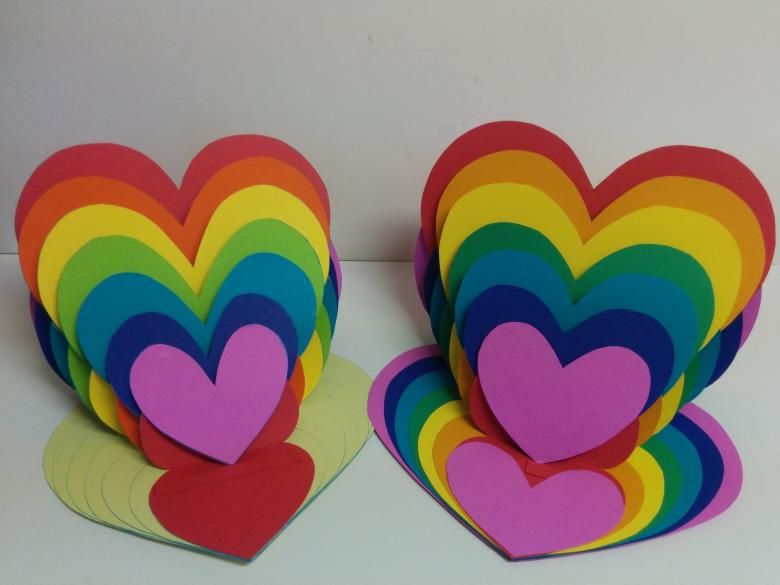 Découpez des cœurs de la même taille dans du papier de différentes couleurs (vous pouvez utiliser toutes les couleurs de l'arc-en-ciel). Plus vous découpez de morceaux, plus l'arrangement sera gonflé. Nous recommandons de découper dix à douze pièces.