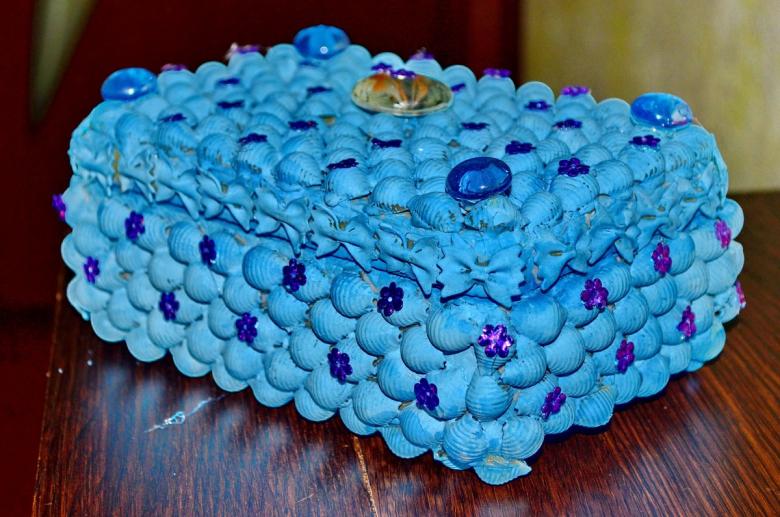 - apprêtez la boîte ronde et collez les pièces de la coquille dessus, en gardant une certaine distance entre elles ;