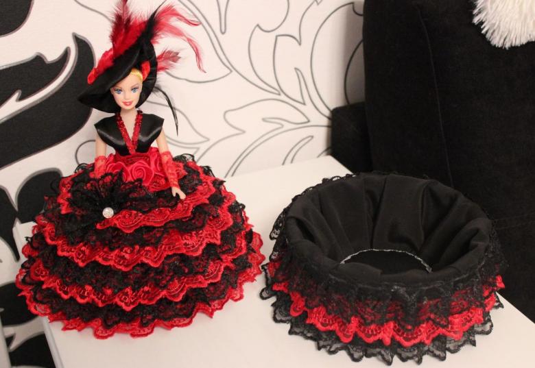 - Adaptez le goulot de la bouteille à la taille de la poupée et collez les parties ensemble. Pour la stabilité, collez un cercle de polystyrène sur le fond de la structure, recouvrez-le de tissu de la même manière que la base, en drapant le tissu autour de la taille de la poupée ;