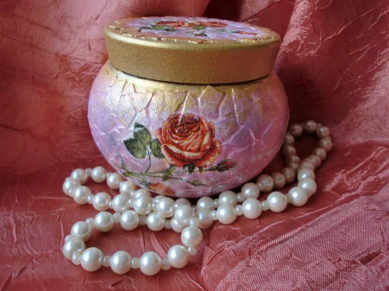 Ce style est similaire à celui du vintage, mais le produit fini a plus un aspect shabby. On utilise des couleurs pastel, des figurines d'anges et des fleurs, et les parties métalliques sont décorées avec de la peinture or ou argent antique. Pour créer l'effet "effiloché", ne frottez pas seulement les coins et les côtes avec une bougie, mais aussi les zones supposées "craquelées".