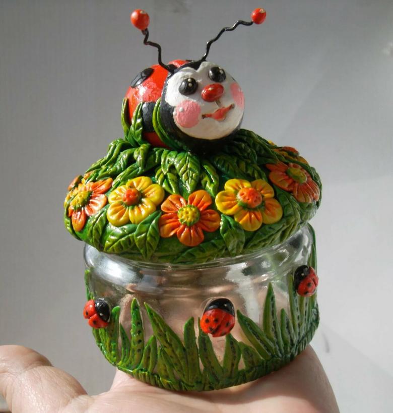 - avec de la pâte polymère, moulez l'élément de votre choix pour décorer le couvercle : un papillon, une fleur, une épingle - tout ce que vous voulez ;