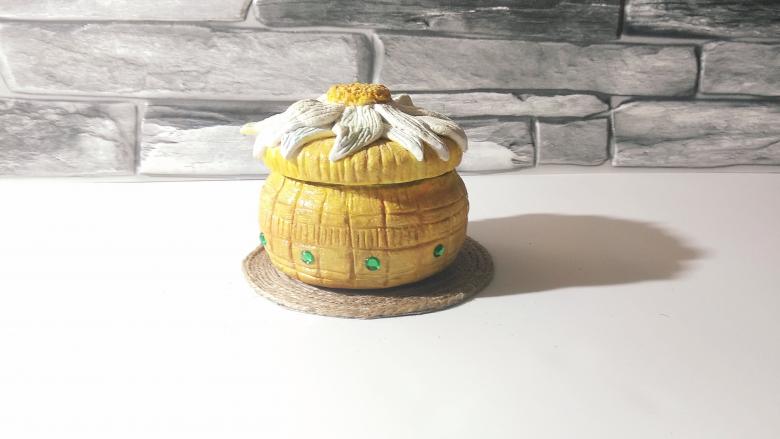 Vous pouvez ajouter de la texture à la surface avec ce que vous voulez : mettez de la peau dessus, créez de petites indentations avec des cotons-tiges. Le couvercle d'un pot peut également être décoré avec de la pâte et une composition de fleurs ou de baies. L'objet est séché en plein air, peint avec de la peinture acrylique et recouvert d'un vernis de protection.