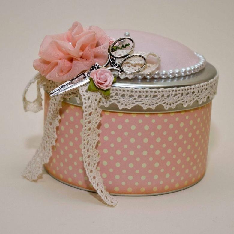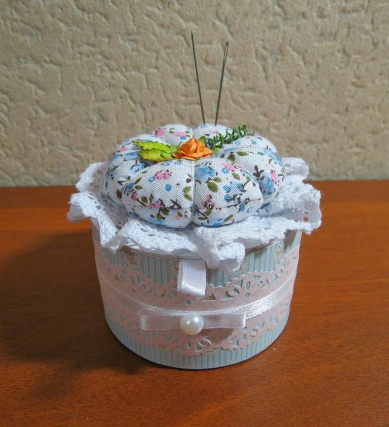 Le cadeau idéal pour une aiguilleuse. Vous aurez besoin de carton, de tissu, de décoration et de matériel synthétique. Découpez un cercle d'un diamètre égal à celui du couvercle. Découpez plusieurs cercles de la même taille dans la feutrine.