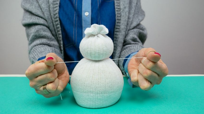 - Utilisez le reste de la chaussette pour faire un chapeau et placez-le sur la tête du bonhomme de neige.