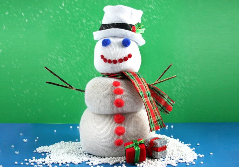 Ce tutoriel vous montre comment réaliser un bonhomme de neige tridimensionnel à partir d'une chaussette ordinaire :