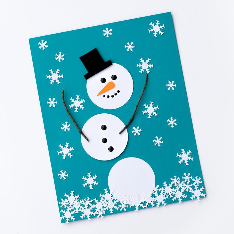 Utilisez du carton épais bleu ou de couleur bleue comme base pour la carte, sur laquelle le bonhomme de neige blanc et les délicats flocons de neige seront du plus bel effet.