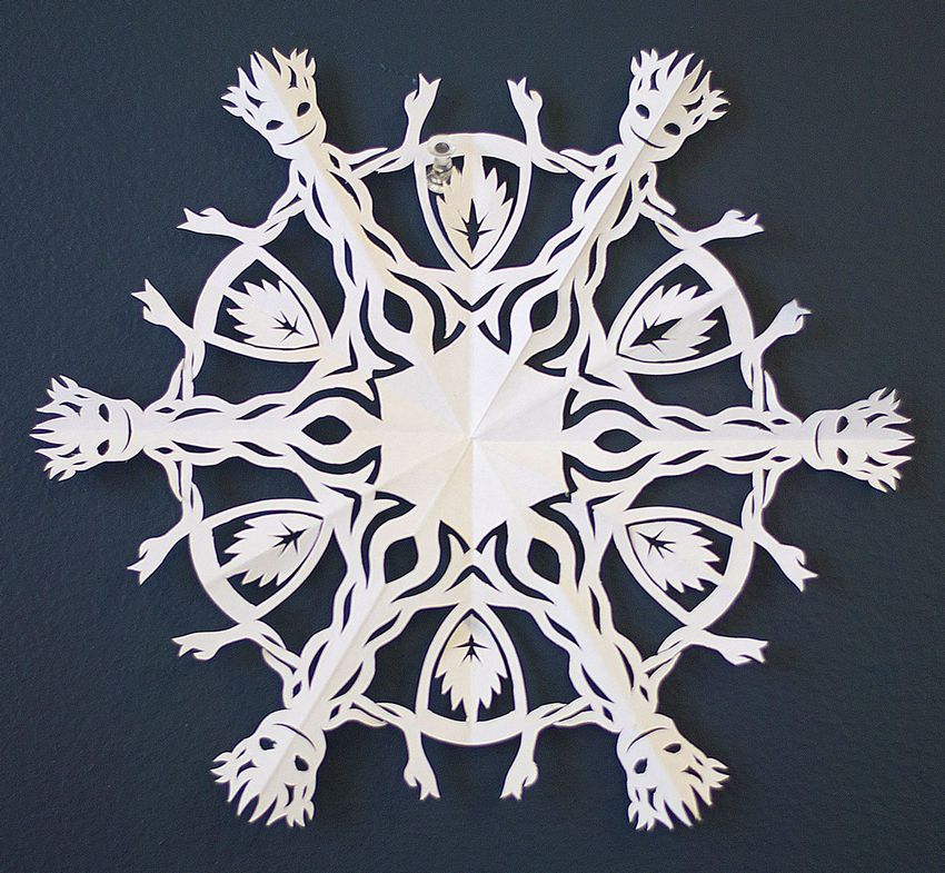 Pour cela, il faudra plier une feuille en accordéon, puis dessiner un ornement et le découper. Vous obtiendrez une bande avec plusieurs motifs identiques. L'étape finale consiste à prendre l'ébauche obtenue dans un anneau et à la fixer.