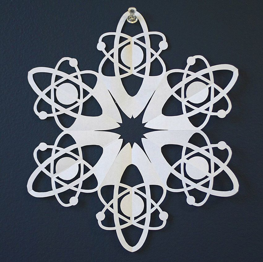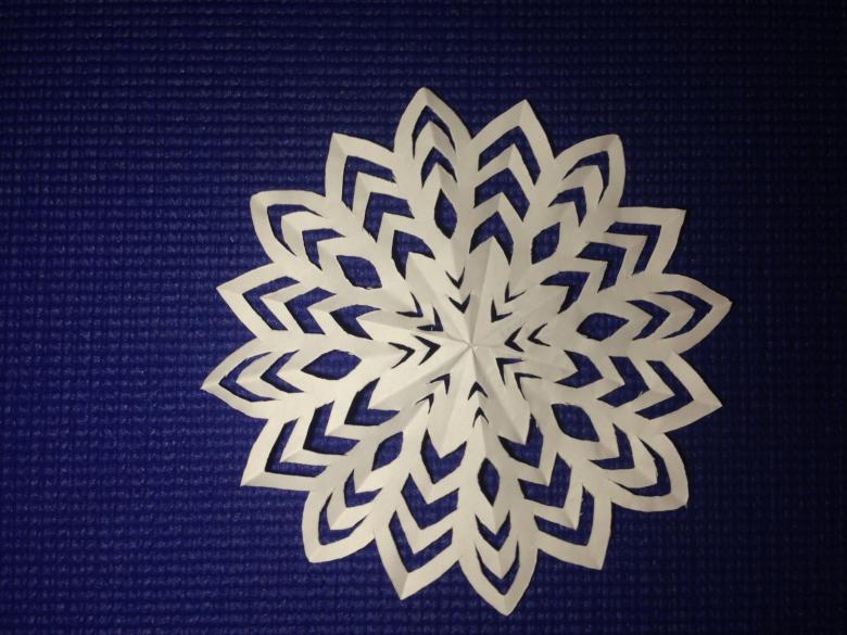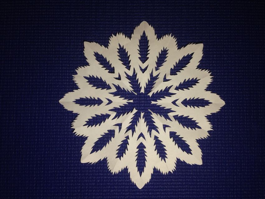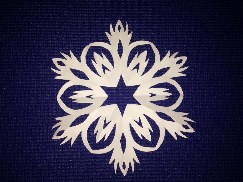 Une méthode simple consiste à plier la feuille cinq fois. Pliez les quatre premières fois en deux et la dernière fois en triangle. Découpez un ornement et dépliez le bricolage.