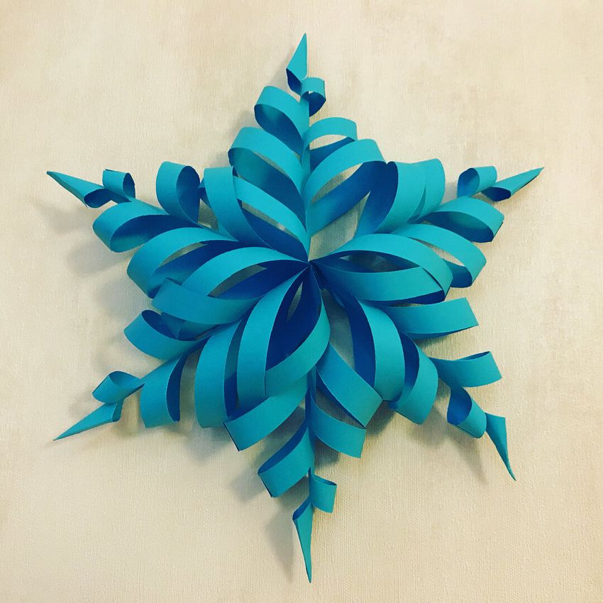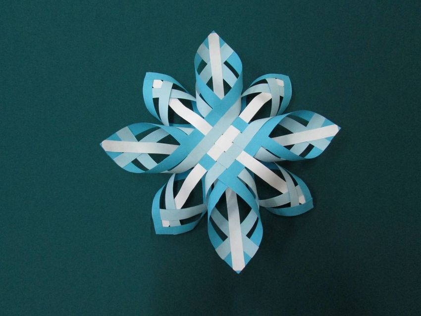 Les extrémités jointes ressembleront à des feuilles. De même, fabriquez un deuxième bricolage et reliez-les entre eux : des bandes non reliées de l'un d'eux pour coller les "feuilles" du premier flocon de neige.