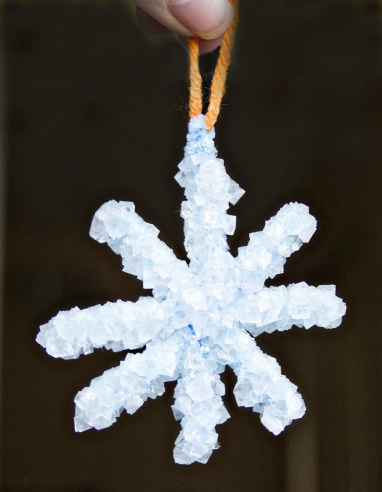 Lorsque le flocon de neige est terminé, collez-le et saupoudrez-le de sel. Utilisez du sel avec des paillettes pour le faire scintiller au soleil dans différentes couleurs.