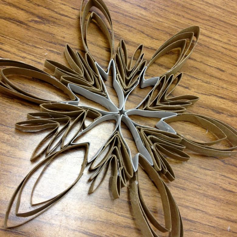 Les manchons de papier toilette font des bricolages ingénieux. Coupez le manchon en plusieurs anneaux de largeur égale. Collez six d'entre eux ensemble. Dans chaque anneau, vous pouvez coller des anneaux pliés en deux. Les créations finies sont mieux décorées avec des paillettes.