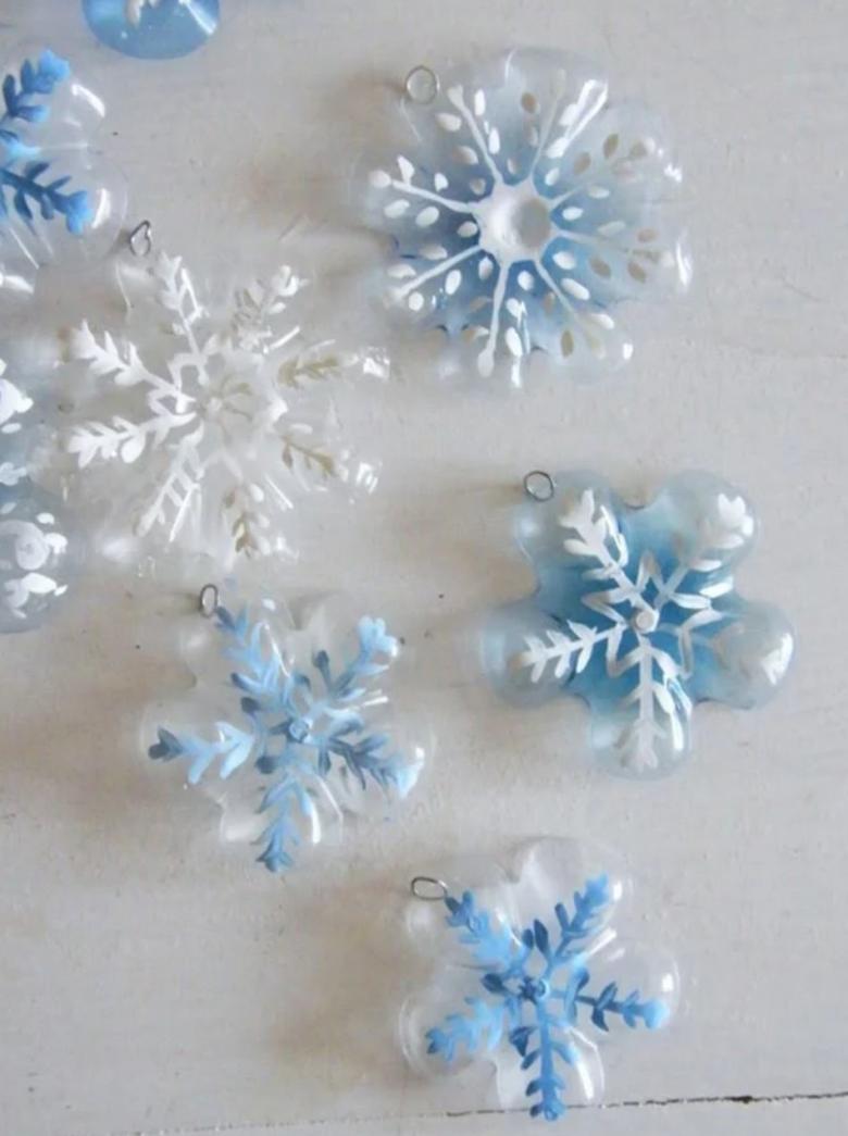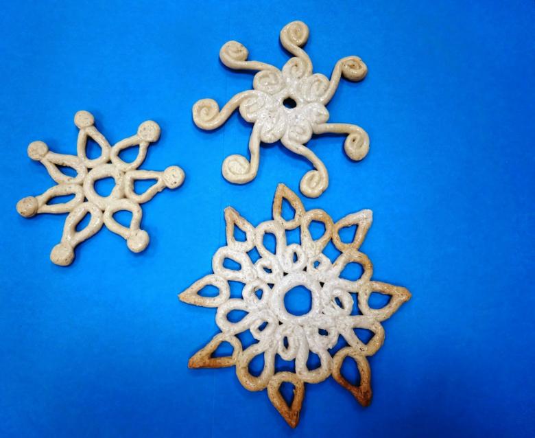 Préparez la pâte feuilletée dans un rapport 1:1:1 (farine, eau, sel). Faites des flocons de neige et décorez-les, ou décorez-les avec des perles ou des paillettes.