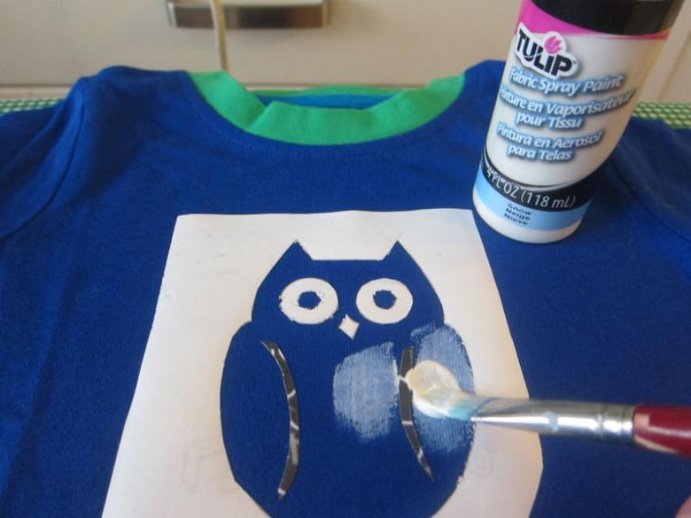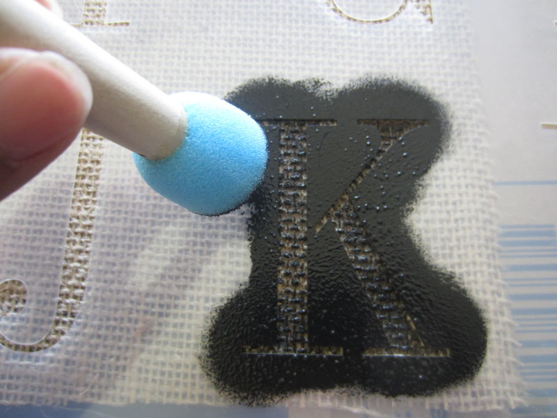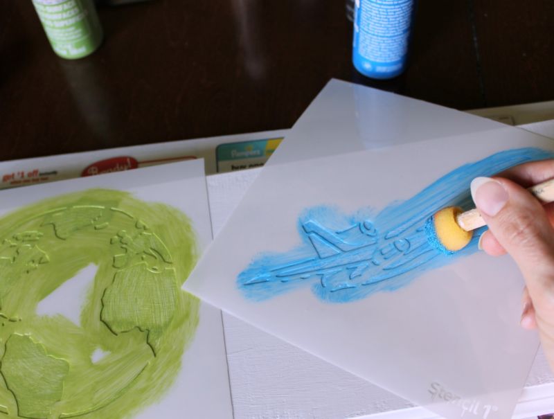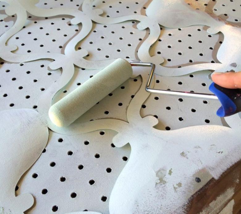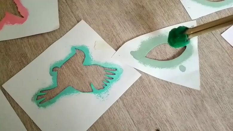 - à l'aide d'un rouleau, d'un pot de peinture ou d'un pinceau, la peinture est appliquée sur les zones libres du pochoir et étalée doucement ;