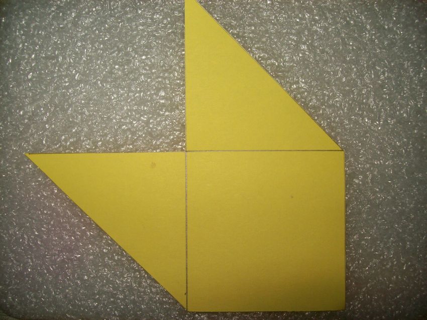 - Le coin supérieur de la feuille est plié en diagonale, la ligne de pliage est marquée et la bande excédentaire est coupée. Détail déplié et coupé en diagonale en 2 parties. Le résultat est 2 triangles.