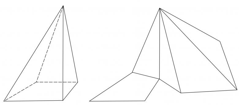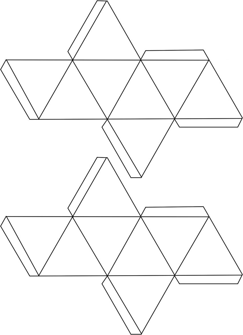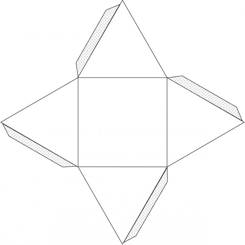 - Un carré est dessiné sur une feuille de papier, des images de triangles équilatéraux sont ajoutées à chaque côté de celui-ci, et des rabats sont formés pour être collés. Pour simplifier l'opération, vous pouvez emprunter un échantillon sur Internet.