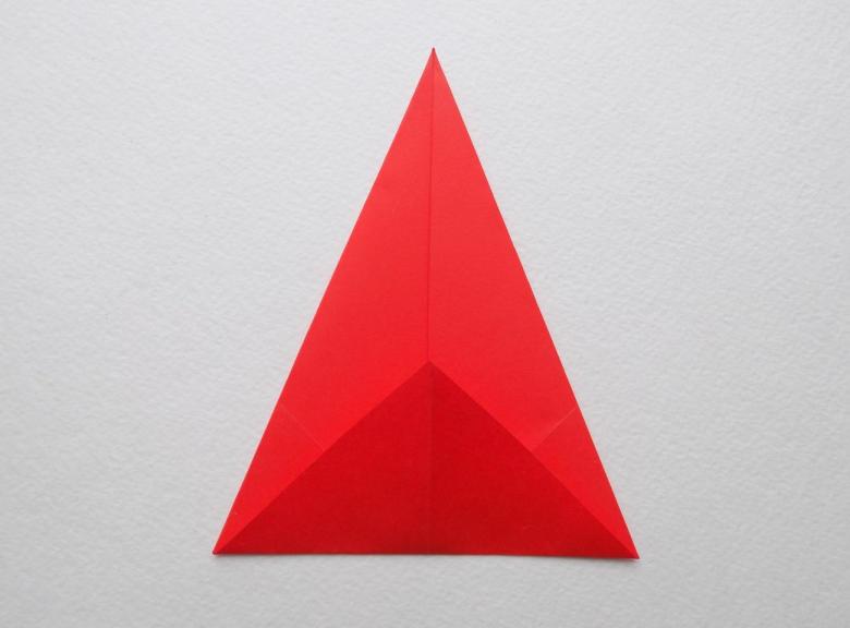 - La base est redressée, selon les lignes de petits triangles formés avec des bords relevés. La base est pliée en deux.