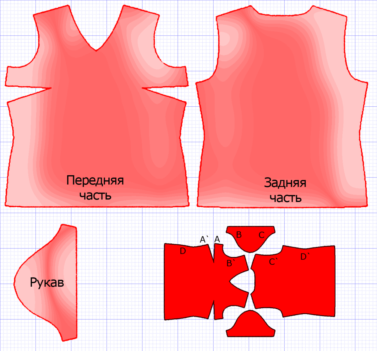 - Découpez les surplus de couture et ajustez le patron sur les moitiés avant et arrière et sur les moitiés de manche.