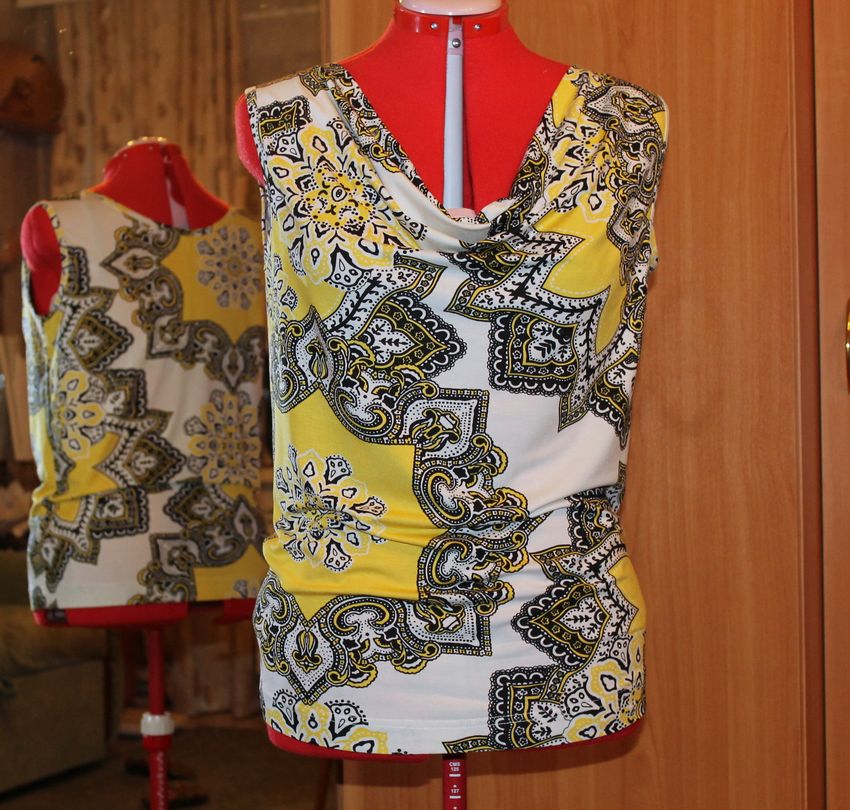 - Coupez l'encolure avec un élastique tricoté ou une couture oblique dans le même tissu. La couture oblique est coupée en biais par rapport au fil longitudinal, afin que le ruban ne tombe pas ;