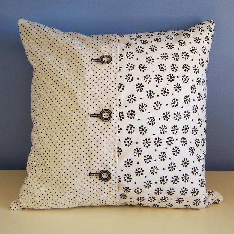 Première version : le modèle précédent avec rabat à boutonnière sert de base. Deux fentes sont cousues sur le rabat pour les boutonnières et les boutons sont cousus sur la housse du coussin (ou vous pouvez les obtenir dans une boutique de broderie).