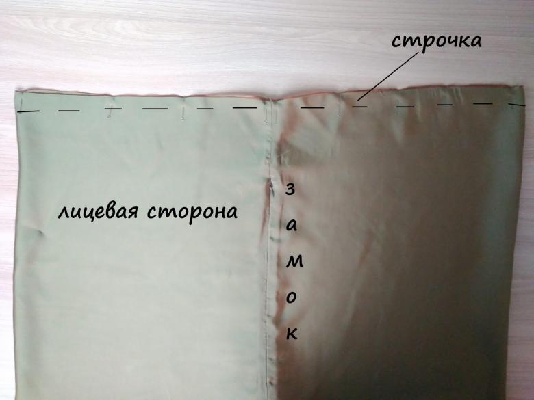 - Retournez la housse, épinglez les bords de la fermeture à glissière non fermée avec des épingles de façon à ce que ses dents soient dirigées vers le haut (lorsque le vêtement est retourné, les dents seront dirigées vers l'intérieur, la fermeture à glissière se fermera à ras) ;