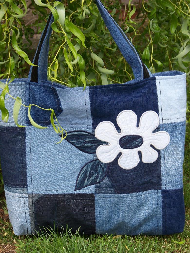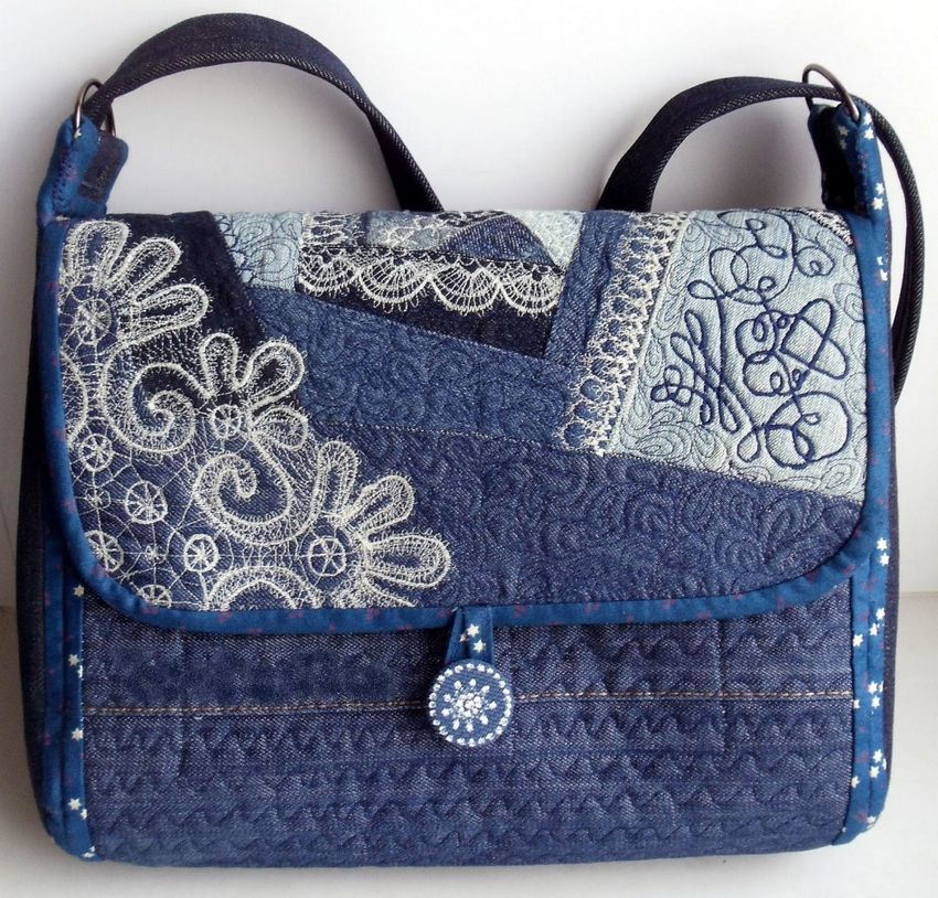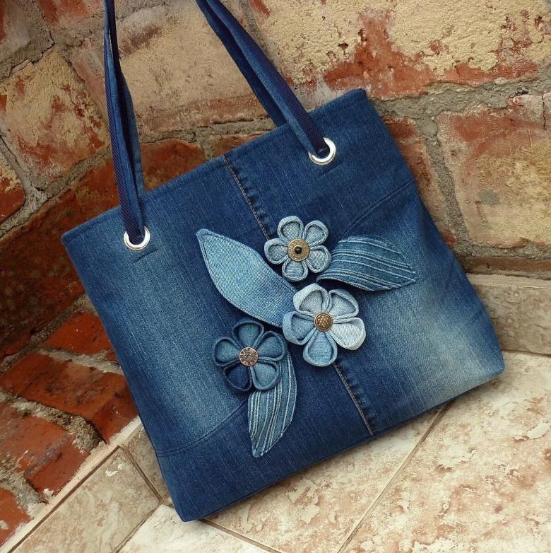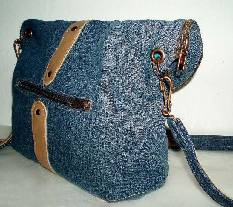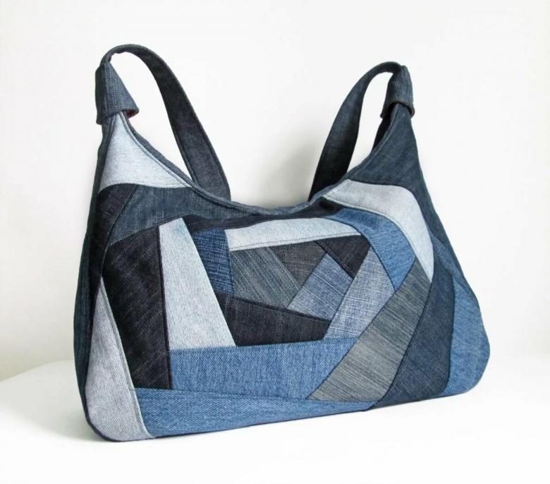 Un motif très simple. On peut l'utiliser pour fabriquer un sac chic à partir de vieux jeans (ou même de quelques-uns). Pour ce faire, des morceaux de différents jeans sont cousus ensemble pour former une toile, et le sac est déjà découpé dessus. Cette version n'est pas conçue pour faire des courses et doit être équipée d'une fermeture éclair. Pour ce faire, vous devrez augmenter les marges de couture sur les côtés. Ces mêmes sacs peuvent également être cousus à partir de vieux chiffons ou vous pouvez utiliser des éléments de vêtement (par exemple, des poches) pour la décoration.