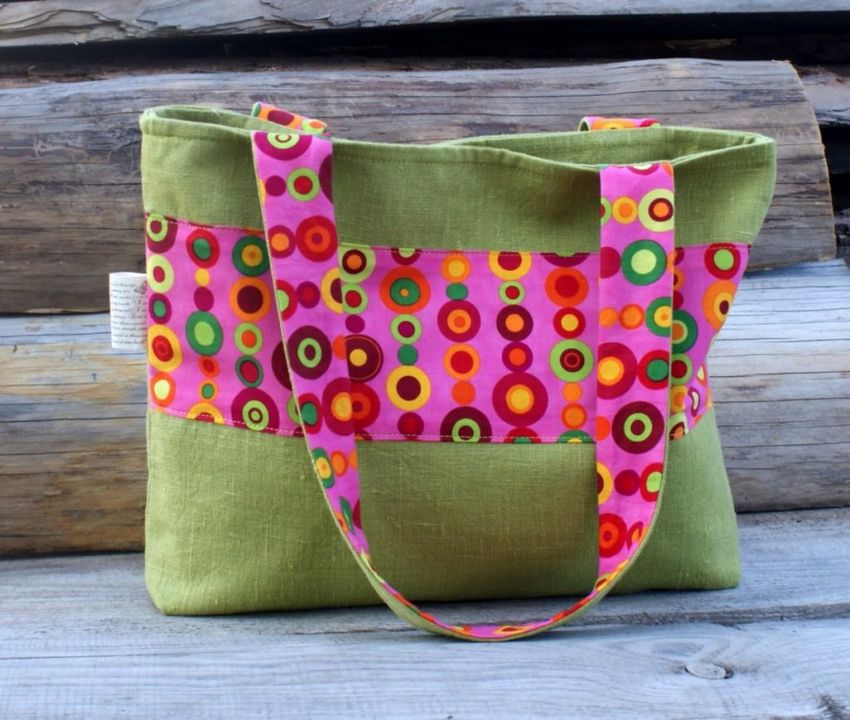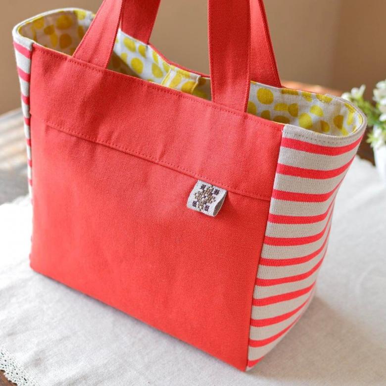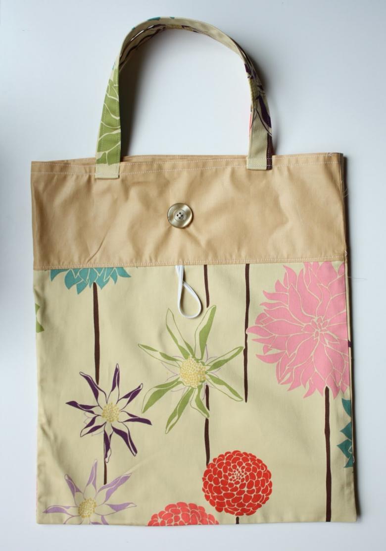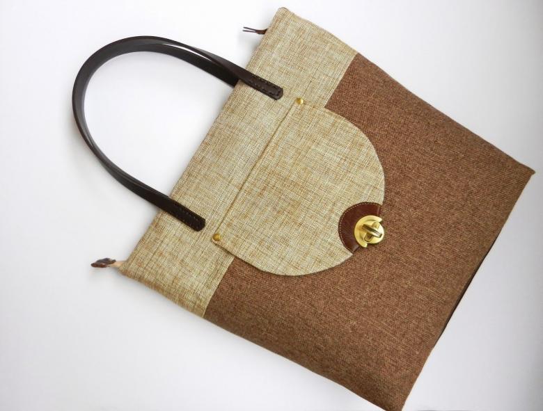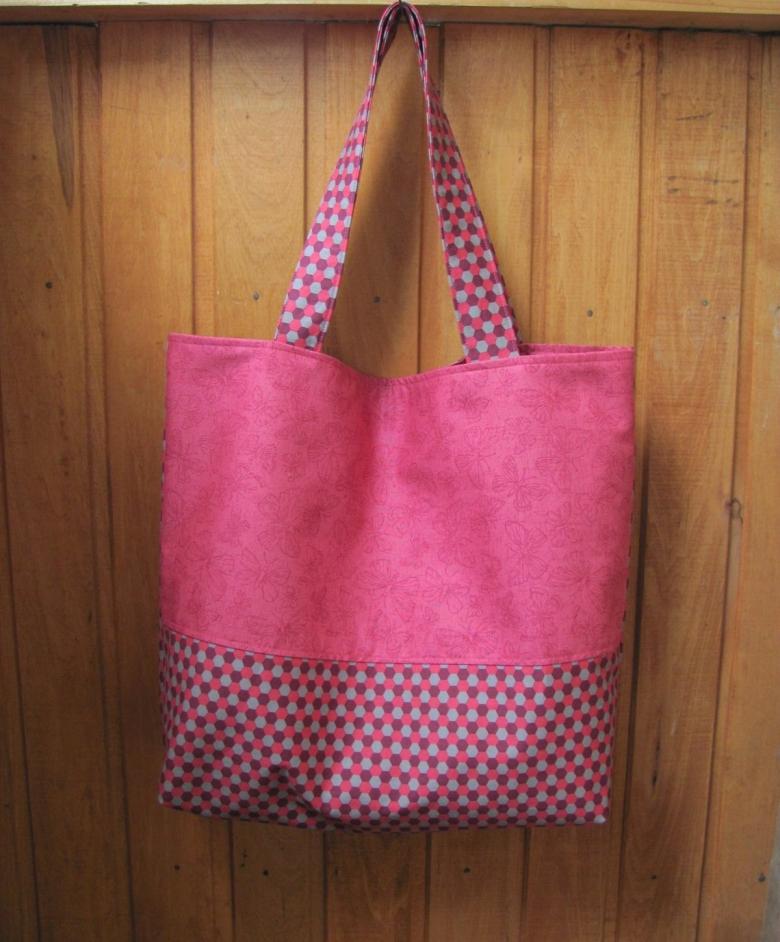 Pour ceux qui débutent dans la couture. Il se compose de deux côtés rectangulaires, d'un fond et de poignées. Le tissu peut être résistant, car le sac sera utilisé pour faire des courses.